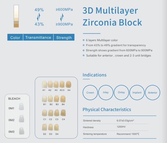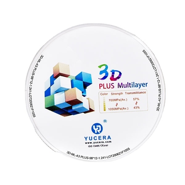 Yucera 3D Plus çok katmanlı zirkonya bloğu, doğal renk dalgasına (koyudan aydınlığa), değişken sertliğe (1050MPa-700MPa) sahip zirkonya malzemesinin en yüksek sınıfını temsil ederve kontrol edilen şeffaflık (43%-57%) tek bir blok içinde servikal incisal kesimlerden.